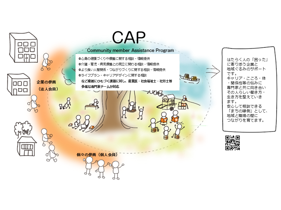 CAPは,一社・職場だけで「社員個々が働くうえで直面する困りごと」を解決していくのではなく,自社がつなぎ目となって地域・業界内で協同し,活用できる地域資源を共有して対処していくものです。 従 来 の「EAP」(EmployeeAssistance Program)は,企業内で完結する支援策としてメンタルヘルス対策等一定の機能を果たしてきましたが,社会も個々も複雑化・多層化が進み,より包括的で柔軟な支援の枠組みが求められており,このCAPという枠組みを多くの企業が関わって地域で実践できるとよいのではと考えています。